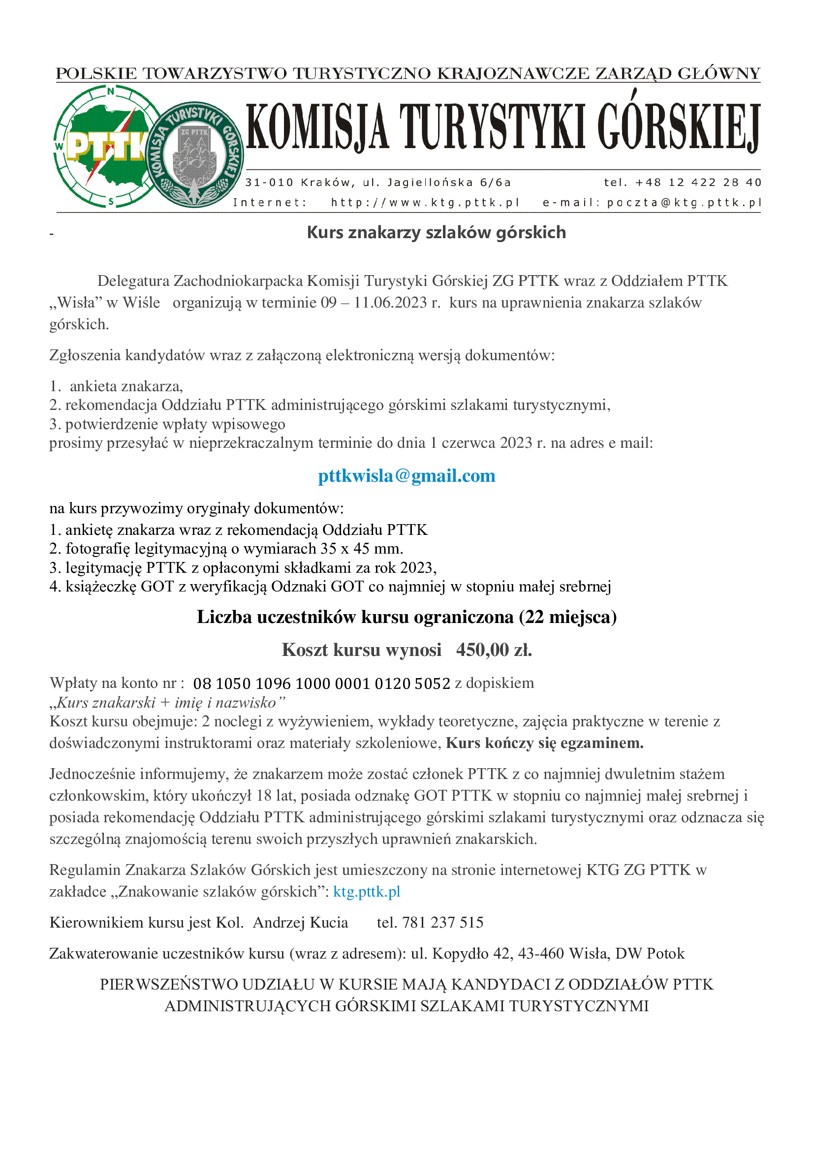 Delegatura Zachodniokarpacka Komisji Turystyki Górskiej ZG PTTK wraz z PTTK Oddział Wisła ” w Wiśle organizują w