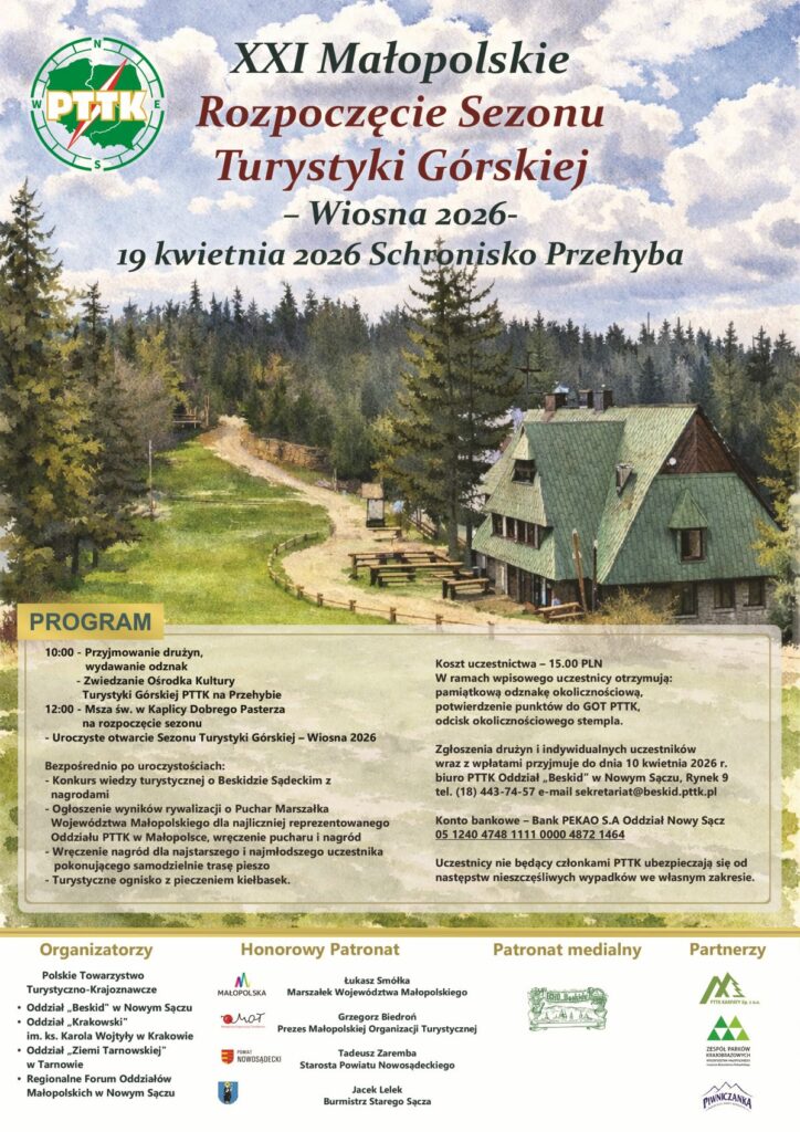 W imieniu organizatorów zapraszamy na XXI Małopolskie Rozpoczęcie Sezonu Turystyki Górskiej w Schronisku Przehyba 19.04.2026 r. Więcej informacji na plakacie